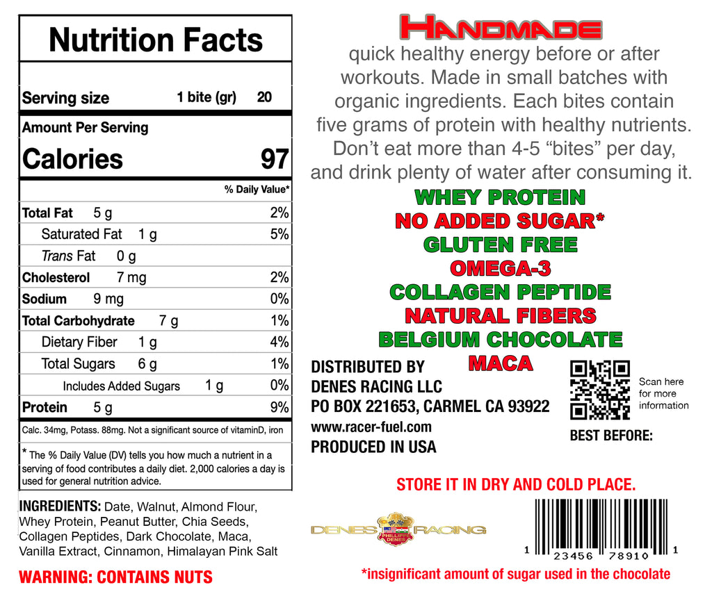 Quick healthy energy before during or after workouts. Each bite contains five grams of protein. No added sugar. Handmade and finished with Himalayan salt.